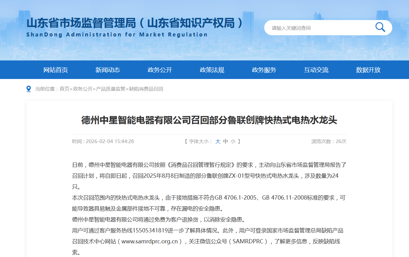 中国质量新闻网讯 据山东省市场监管局网站消息,日前,德州中星智能电器有限公司按照《消费品召回管理暂行规定》的要求,主动向山东省市场监督管理局报告了召回计划,将自即日起,召回2025年8月8日制造的部分鲁联创牌ZX-01型号快热式电热水龙头,涉及数量为24只。