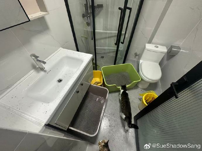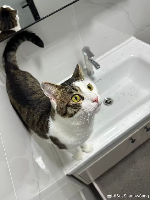 鼻嘎今晚成精了 居然把水龙头打开了,这可是向上开的水龙头!它这一开把肉包和夏天吓得炸毛了,然后它立马关上了,还怪贴心的……不过水槽里已经积水了,它还把水扒拉进猫砂盆里,弄得一片狼藉 大晚上的真是辛苦猫爸了